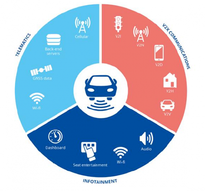 Primarily, connected cars are generating data from three different categories of functionalities: Telematics, V2X and Infotainment (see Figure 1 below).