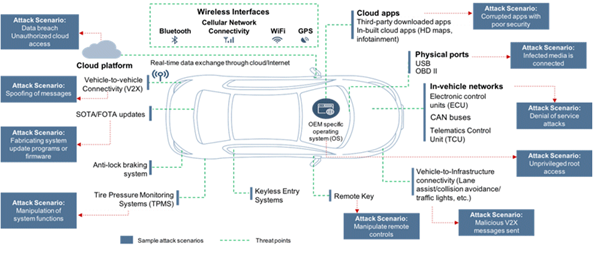 Another big challenge for the connected car ecosystem is the now-increased vulnerability of cyberattacks and hacking threats. The transformation of the automotive industry into one offering digital mobility products and services has given rise to importance of cybersecurity in the connected car ecosystem (see figure 2 below). Though the digital features in connected cars are adding great customer value, they are also exposing connected cars to multiple touchpoints for possible cyberattacks. As connected cars have more and more in-vehicle software units, hackers have access to electronic systems and data, posing potential threats to critical safety functions and data privacy.