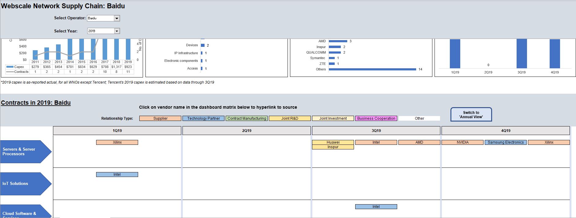MTN Consulting’s “Webscale Network Supply Chain Analyzer” tracks technology spending in this sector by digging deep into the webscale-related supply chains of each operator. The Analyzer tracks contracts/deals between WNOs and technology vendors across eight product categories, and provides detail on type of relationship and nature of deal. The goal is to provide a comprehensive view of the competitive landscape facing vendors who aim to sell or partner with webscale operators.