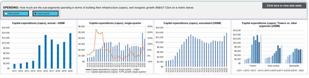 The growth of the CNNO market continues to come from both acquisition of assets (including telco spin-offs) and organic investment. The CNNO sector’s $29.3B in capex was nearly triple its $10.3B in M&A spend in 2020, but this relationship is sometimes reversed, as in 2017 when big deals from China Tower, Crown Castle, and American Tower drove M&A spend sky high. Cellnex was the most eager acquirer in 2020, with $6.5B in M&A costs on the back of deals with Iliad, Altice, Arqiva, and CK Hutch. Digital Realty and Equinix were also significant, with the former buying Interxion, and the latter purchasing Packet, GPX India, and 13 data centers from Bell Canada. The fiber/bandwidth segment had a quiet year for M&A in 2020, in part due to the privatization of Zayo, which had been an active acquirer in the past.