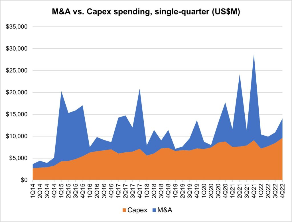 3. Spending (M&A; Capex): annual, single-quarter, and annualized (US$M)