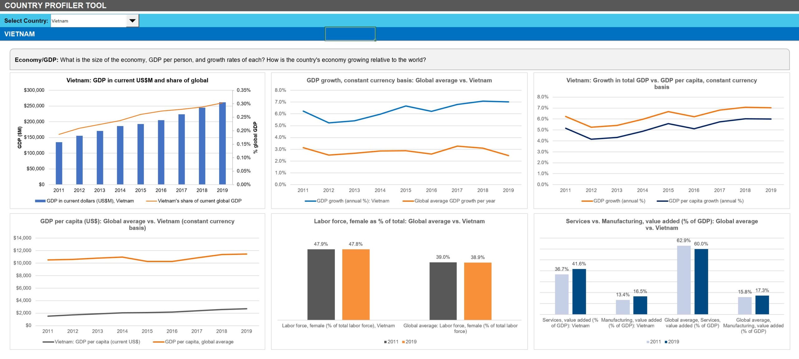 This report includes a drop-down selector allowing the user to select one of 167 countries and automatically populate a series of charts. The names of the charts are as follows, using as an example the country of Vietnam: