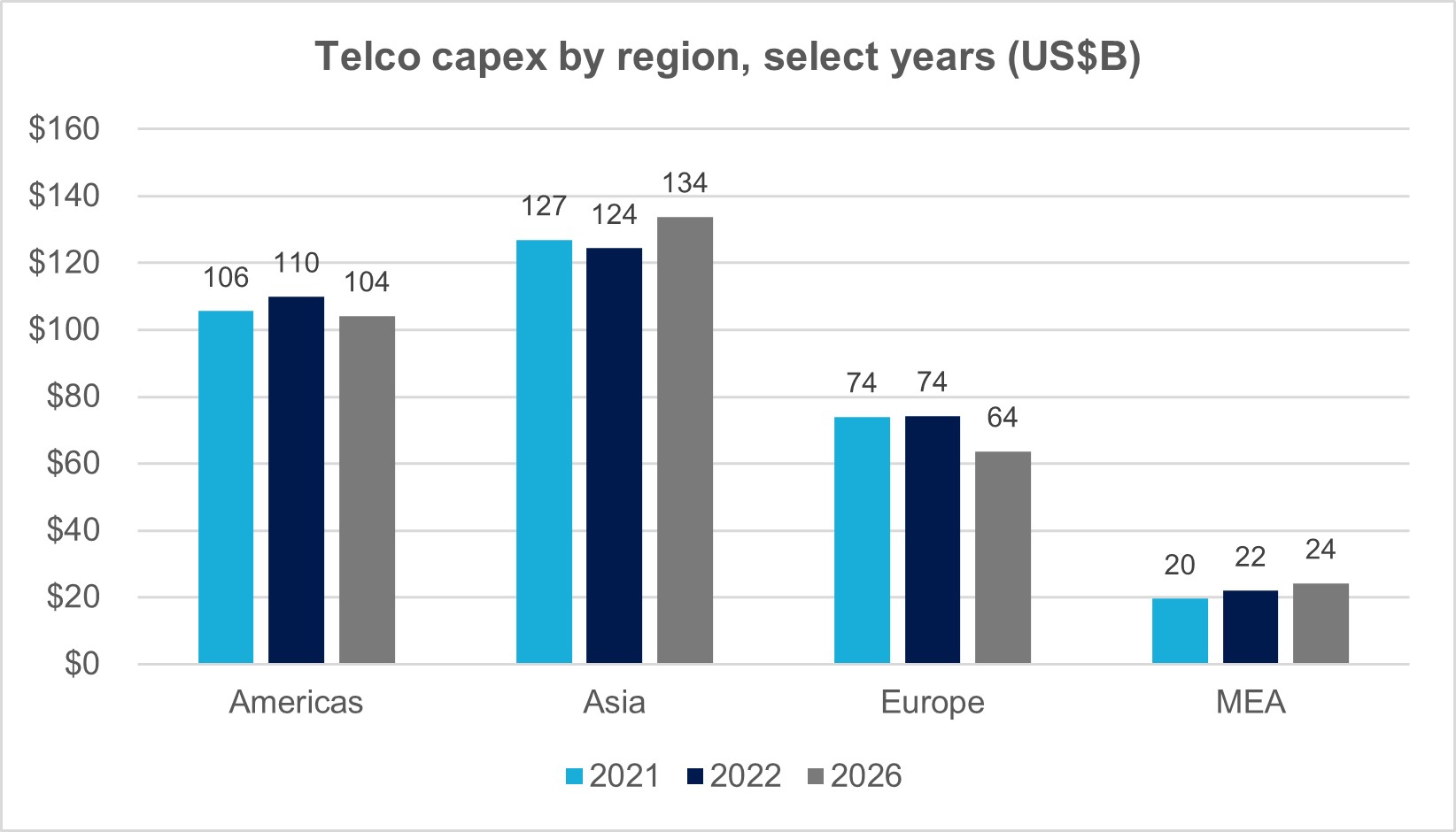 • Telco capex by region, select years (US$B)