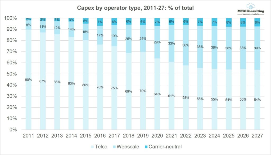 The three groups of operators we track pursue a range of different business models, even within segments. Webscale revenue models revolve around a diverse mix of advertising, devices, software, cloud services, and ecommerce. Carrier-neutral providers, to simplify, rent network infrastructure to other businesses. Telcos sell subscription and pay-as-you-go services for communications services, including bandwidth, video, mobility, and enterprise services. There is a huge amount of variety in these discrete market segments. What’s more important, though, is that the three segments rely on each other in important ways. Carrier-neutral players get most of their revenues from telcos & webscalers needing to fill gaps in network coverage and accelerate time to market. Telcos rely on CNNOs to lower their cost of operations, and need webscalers to provide services and apps which make their network worth using beyond telephony. Webscalers lack last mile access networks and can only deliver their services to the mass market over telco infrastructure. Webscalers also, despite big capex outlays, can only blanket the globe with data centers by partnering with CNNOs for collocation.