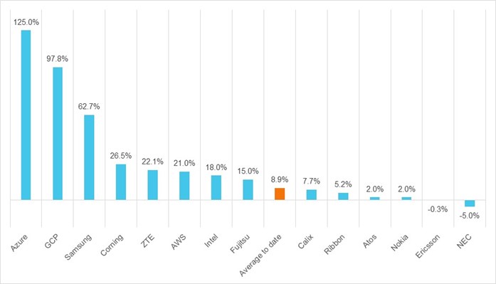 Figure 1: Telco NI vendor revenue growth in 3Q21, YoY % change (preliminary)