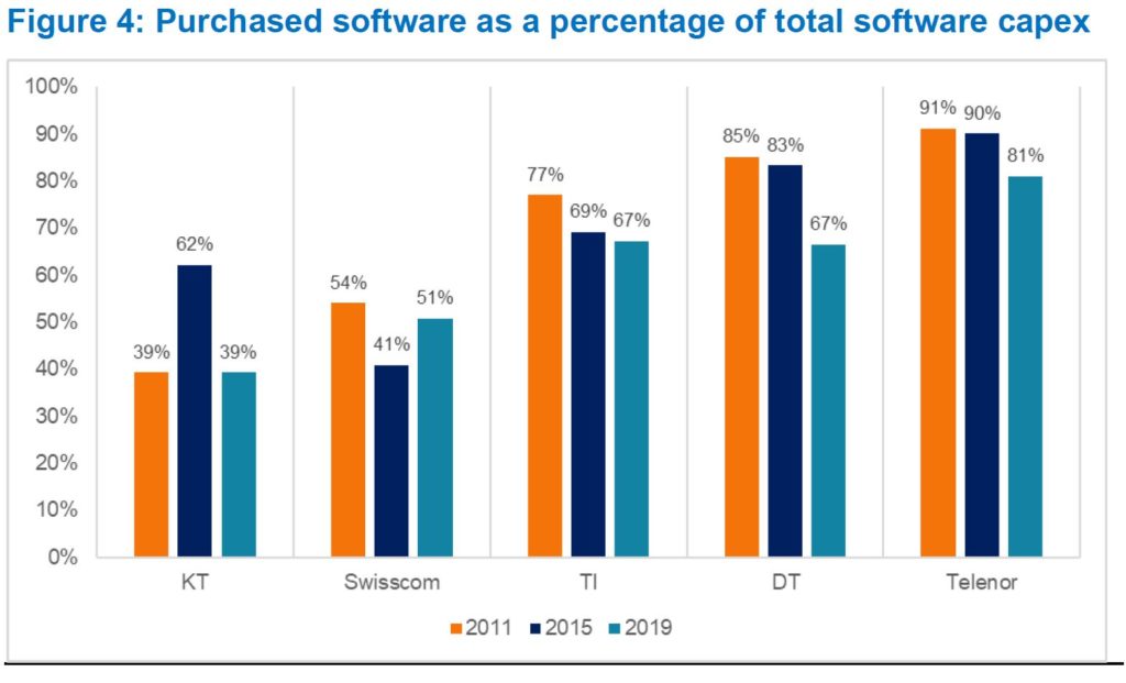 Figure 2: Total telco capex (billion, USD) and software as a percentage of total, 2011-19