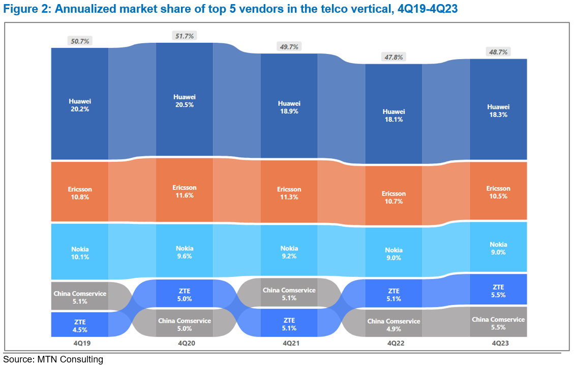 Figure 2: Annualized market share of top 5 vendors in the telco vertical, 4Q19-4Q23