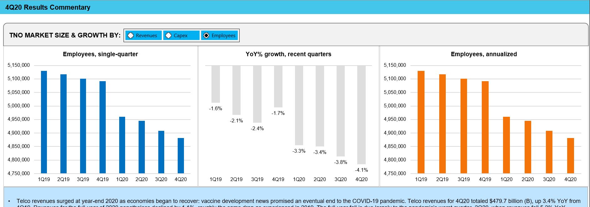 - TNO market size & growth by: Revenues, Capex, Employees – 1Q19-4Q20