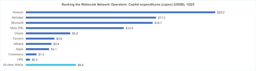 Top 1Q25 capex outlays came from Amazon ($25.0B), Alphabet ($17.2B), Microsoft ($16.7B), and Meta ($12.9B. Together, that is 74% of the total.