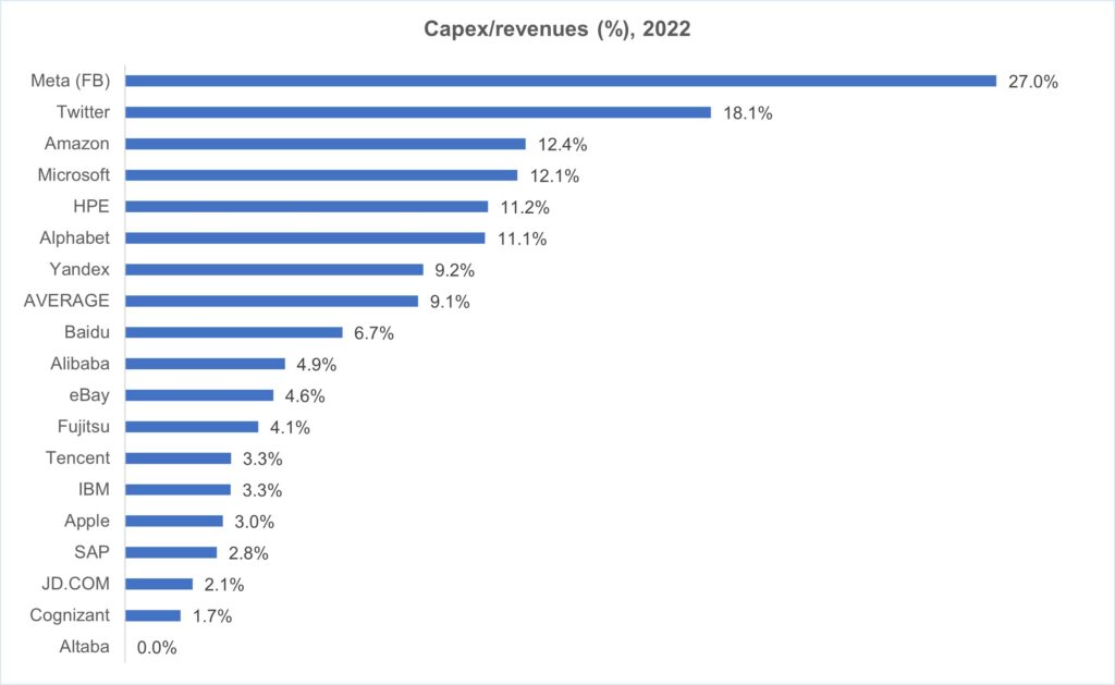 R&D spend was $280B for the 12 months ended March 2023, up 22% YoY. R&D spend as a percentage of revenues is now 12.5%, up from 10.5% in 1Q22 and easily the highest figure in a decade. Meta (Facebook) is the biggest R&D spender at over 31% of revenues; it has extended its lead with its metaverse push. Baidu is a strong second, focused on AI and autonomous vehicles. Amazon is #3. AI, including new generative platforms like ChatGPT and Bard, will likely drive webscale R&D spending over the next few years.