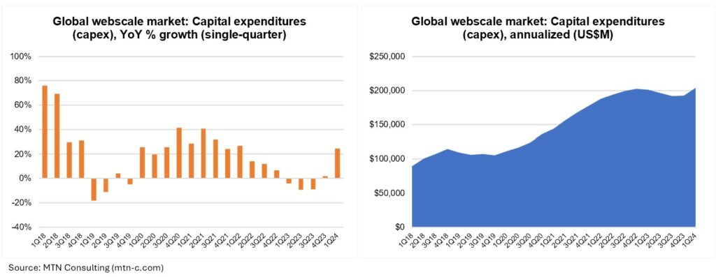 Total capex for the four quarters ended 1Q24 was $204B, up 1.5%. For 1Q24 alone, capex was $56.9B, up a whopping 24.7%. Moreover, the tech piece of capex has been surging: Network/IT and software capex for webscalers was about $35.4B in 1Q24, up 53%. That is unlikely to be the norm, to be clear. Capex is volatile in the webscale sector and driven by just a few big players; the top 4 captured 78% of 1Q24 annualized tech capex. But the prospects for 2024 are strong.