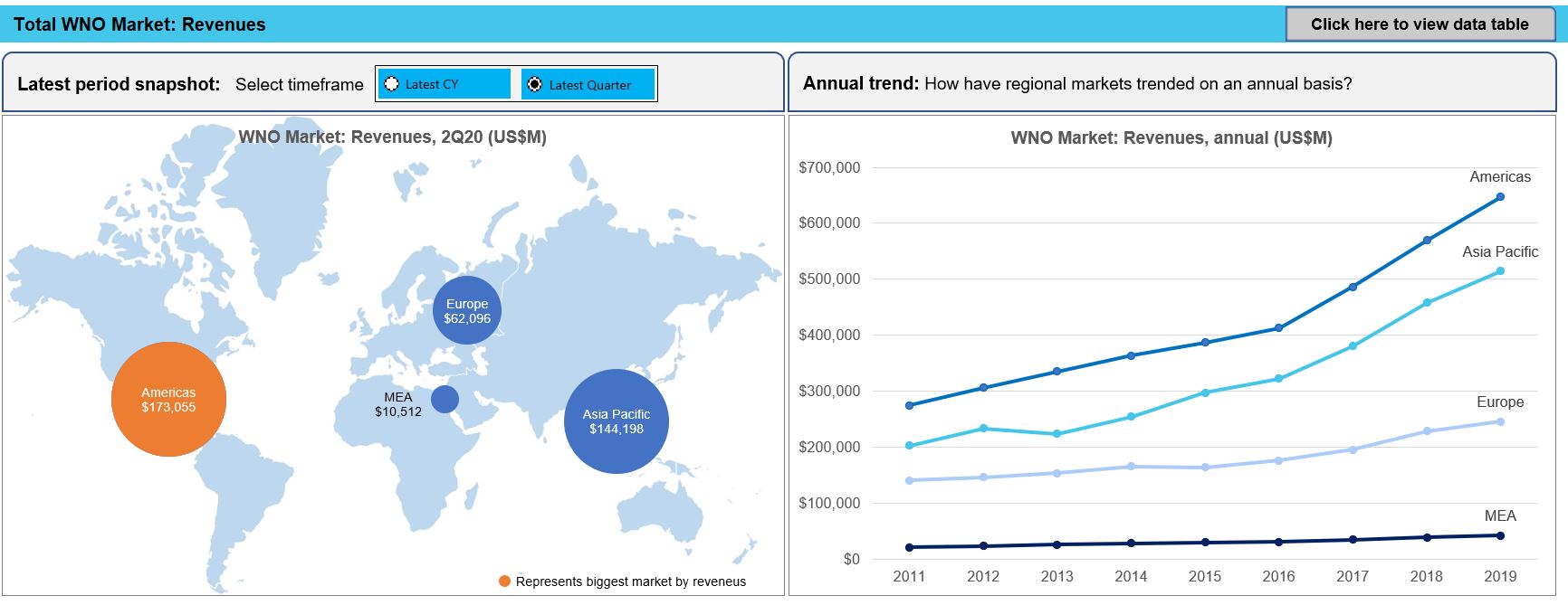 - Total WNO Market Revenues, by region: Latest CY; Latest Quarter; Annual trend (2011-19); Single quarter (1Q14-2Q20)