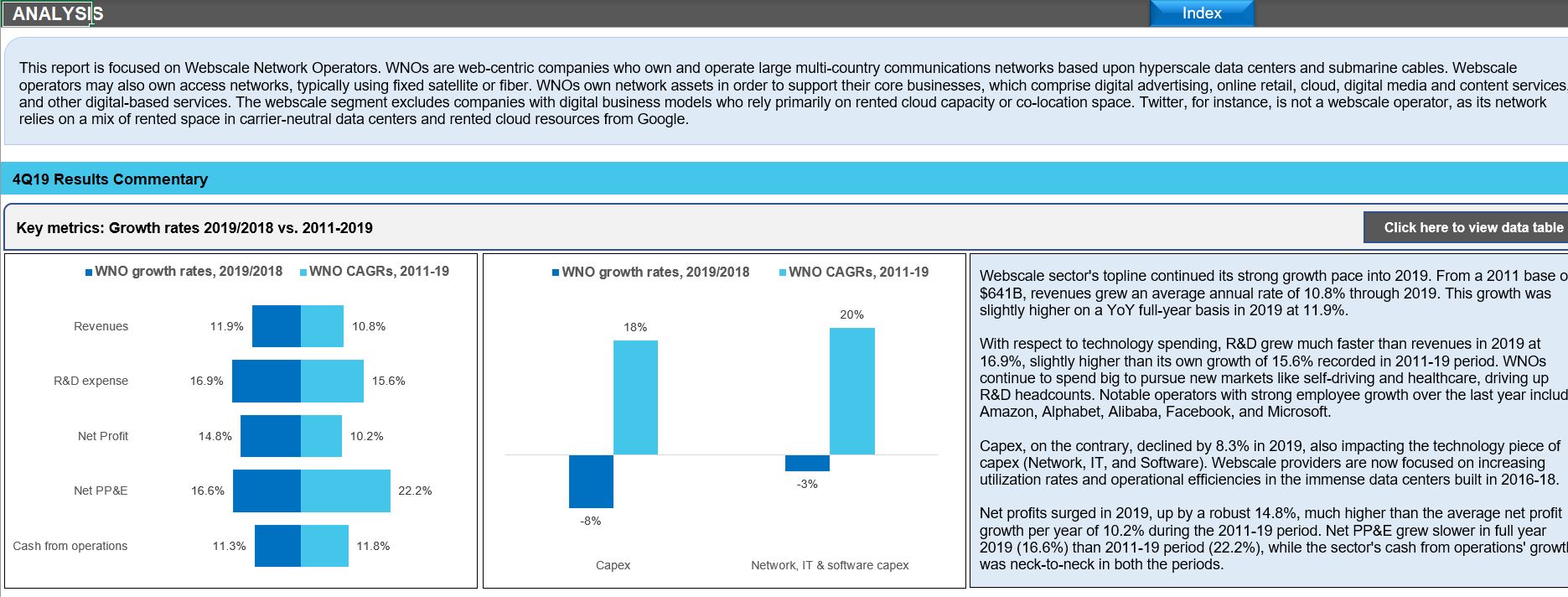 MTN Consulting’s 4Q19 WNO Market Review analyzes the network infrastructure spending and financial position of webscale network operators (WNOs).