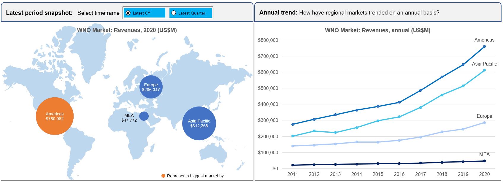- Total WNO Market Revenues, by region: Latest CY; Latest Quarter; Annual trend (2011-20); Single quarter (1Q14-4Q20)