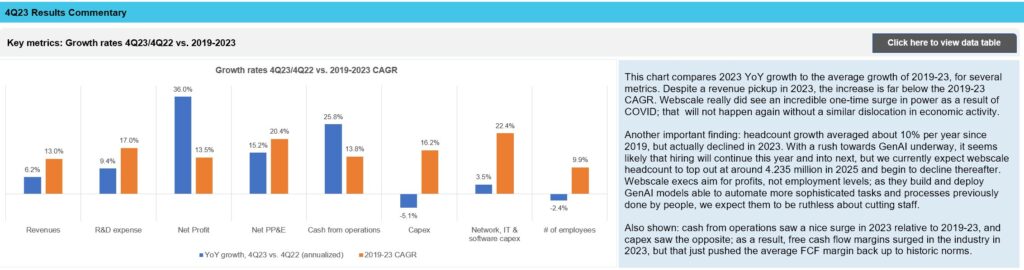 Revenues per employee in the webscale sector ended 2023 at $584K, from $539K in 2022; free cash flow per employee jumped even more noticeably, from $73K in 2022 to $109K in 2023. These swings are due both to rising revenues and even more quickly rising profits, and the sector’s headcount growth taking a pause in the last two years. Webscale headcount ended 2023 at 4.093M, slightly up from the YE2021 figure but handily down from the 2022 total of 4.194M. Meta saw by far the biggest dip in its workforce, down 22% in 2023 to 67,300. This recent wave of layoffs was due in part to overhiring during COVID. There is a good chance that we will see additional layoffs across the sector though as big webscalers attempt to impement Generative AI in their own operations in search of labor cost savings. The same thing is already happening in the telco sector.