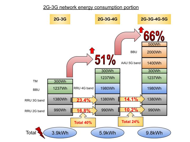 For this blog, though, what we really need to know is the contribution to total energy consumption of the legacy network elements as you upgrade to newer technology. These values are presented in figure 4 in the yellow arrows. So, in 2G/3G/4G base stations, about 40% additional energy is consumed by holding on to the 2G and the 3G layer. Similarly, in a combined 2G/3G/4G/5G base station, roughly 24% extra energy is consumed because of still holding the 2G and the 3G layers in this base station.