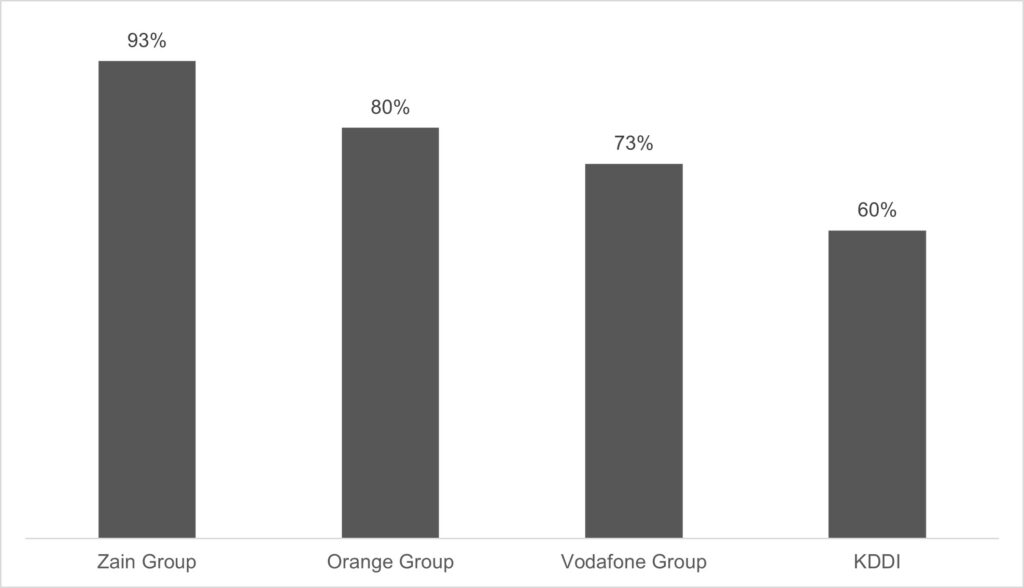 Taking KDDI as an example from Figure 1, this company provides a range of services that are not mobile related; MTN Consulting estimates that KDDI’s mobile network accounts for only about 60% of total company energy consumption. But for Zain, this ratio is 93% as this company is almost exclusively focused on mobile services.