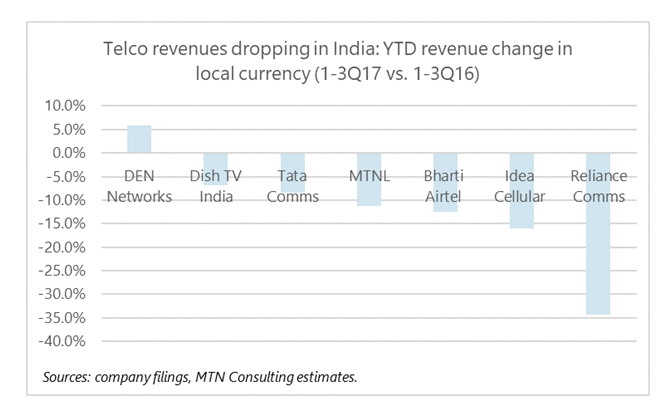 Just recently, in November 2017 the Indian regulator TRAI announced a net neutrality recommendation, concluding that telcos cannot unfairly prioritize content. This was a win for OTTs. India’s telecom regulators are now pursuing more open, pro-consumer policies than the US FCC, which today voted to end America’s version of net neutrality. However, the TRAI’s recommendation still needs to be formally adopted by the government, and India’s telcos are lobbying hard for relief. In fairness, this comes at a tough time for them, as they’re facing high debt and weak revenues, made worse recently by the rapid growth of new entrant Jio. The figure below shows how stark the revenue declines have been for many in recent quarters.