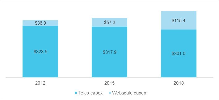 As webscale players have built out their networks, they have become more influential across the industry. Their buying power alone is a major reason; Figure 2 shows how webscale operator capex has grown dramatically since 2012, while telco capex has stagnated.